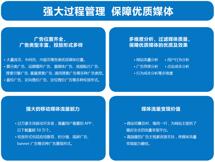億瑪憑借強大媒體覆蓋能力,運用多種手段保證媒體質量及投放效果,一方面為媒體實現流量變現,另一方面為廣告主實現廣告價值。