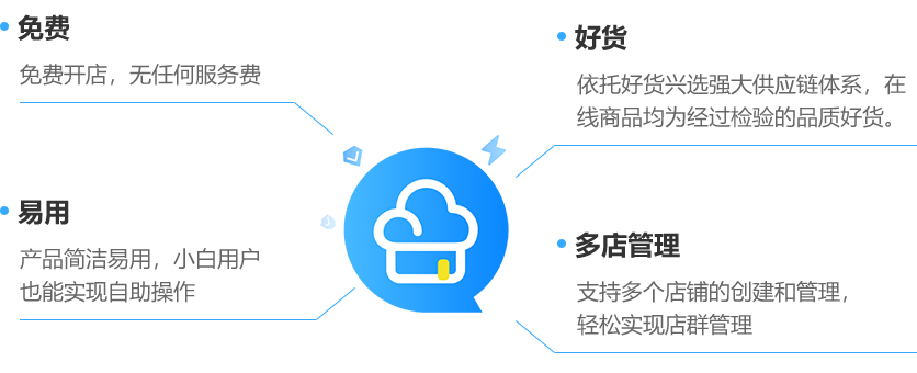 好貨云店借助好貨興選SAAS服務,從而提升新媒體流量渠道電商變現效率與收益。強大的供應鏈能力,為有流量的網紅/社群等新媒體B端用戶提供免費一鍵開店。